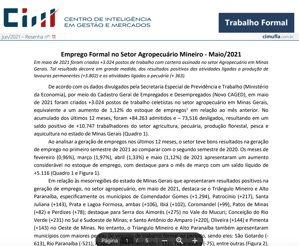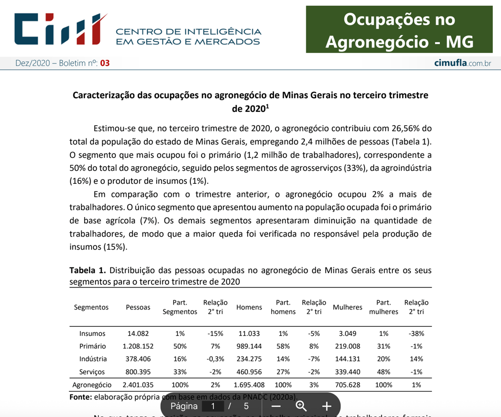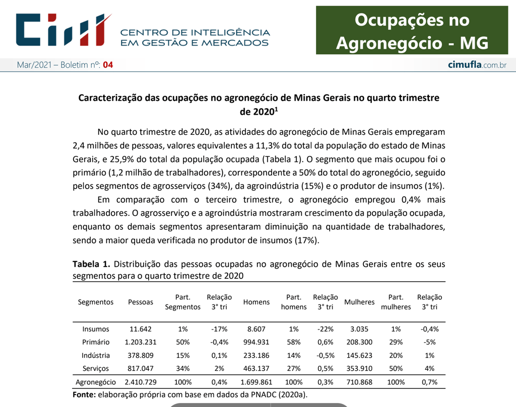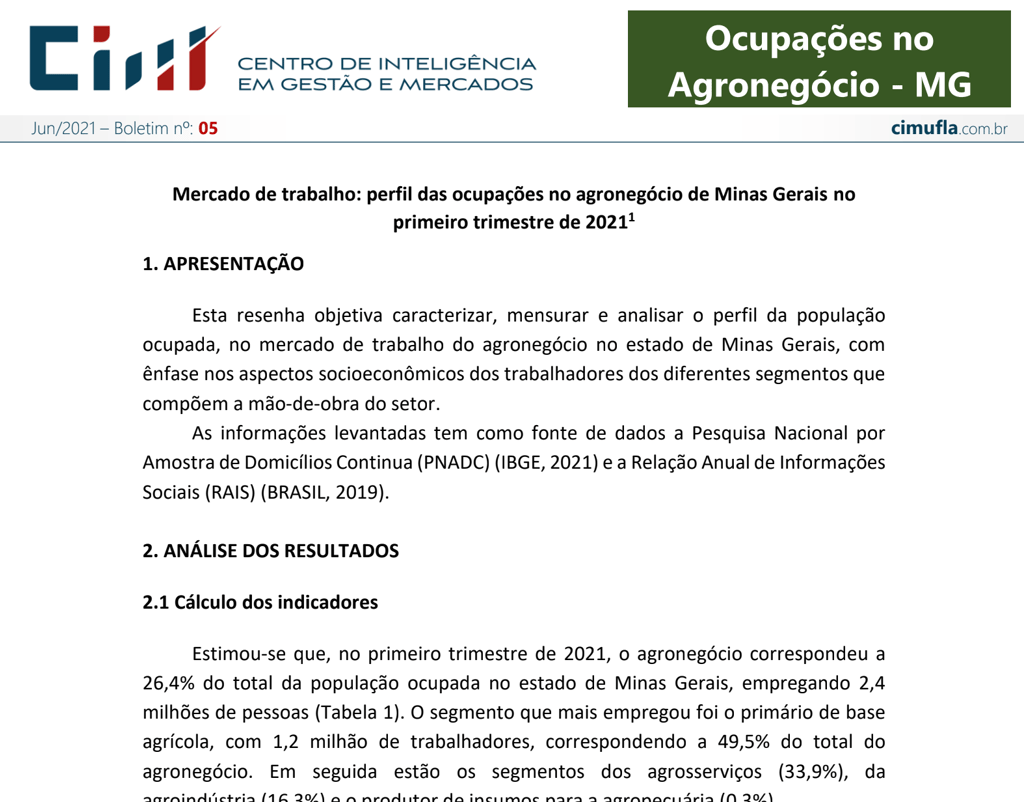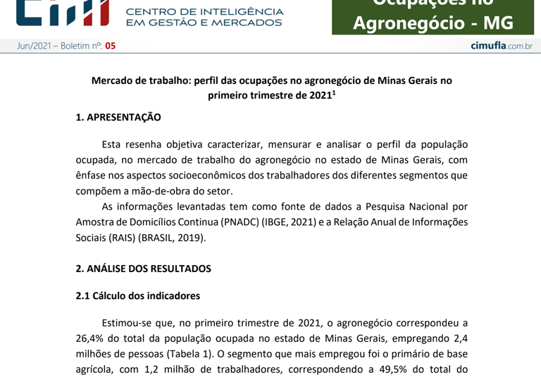 Mercado de trabalho: perfil das ocupações no agronegócio de Minas Gerais no primeiro trimestre de 2021¹