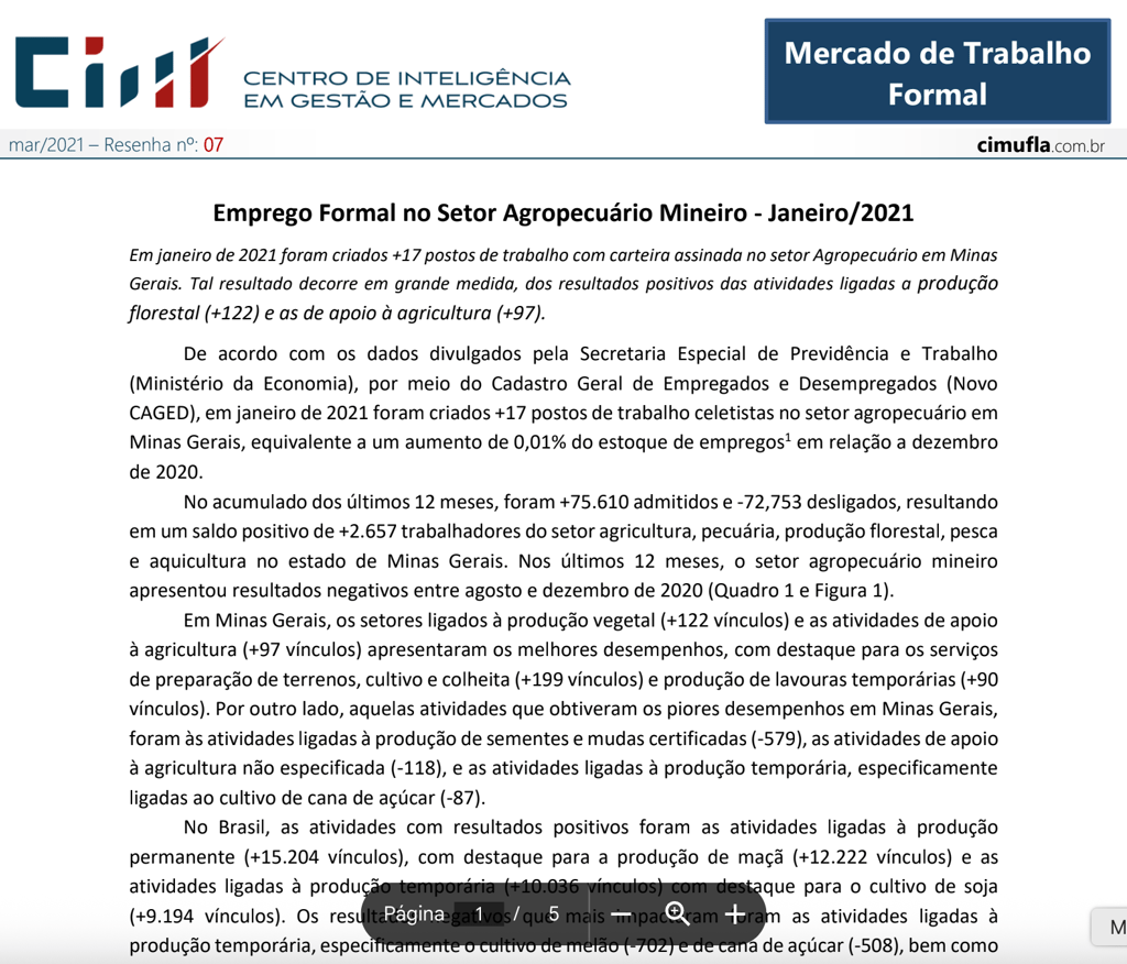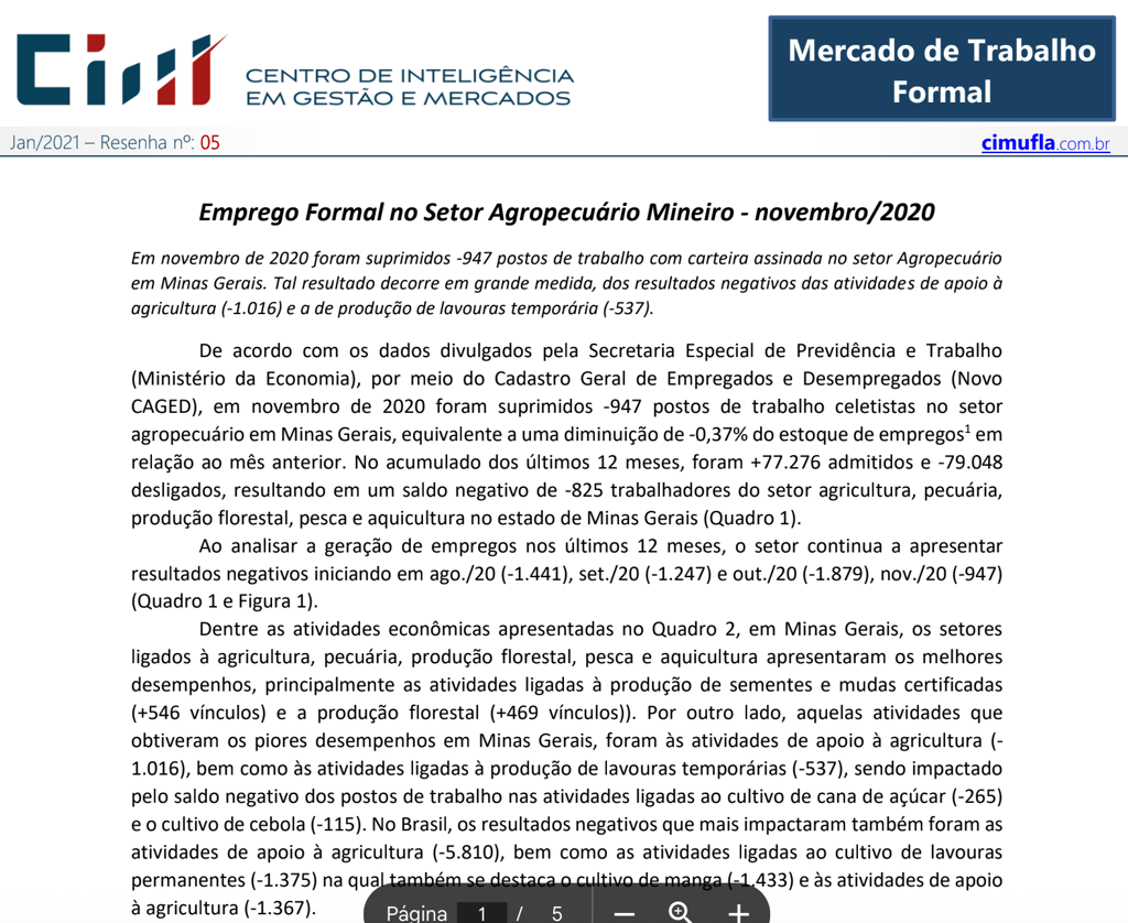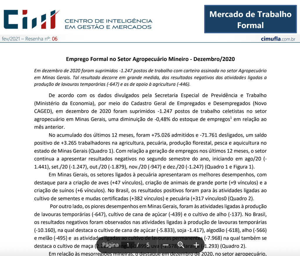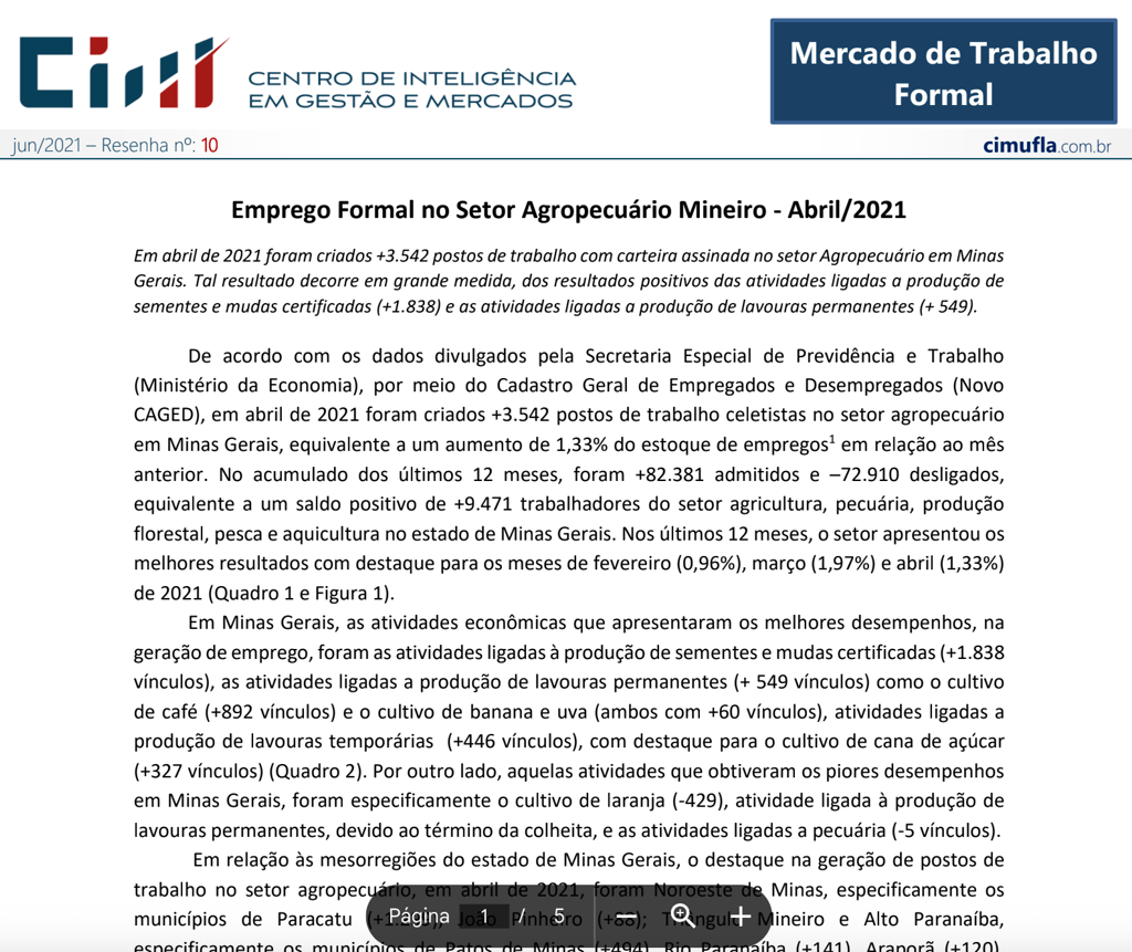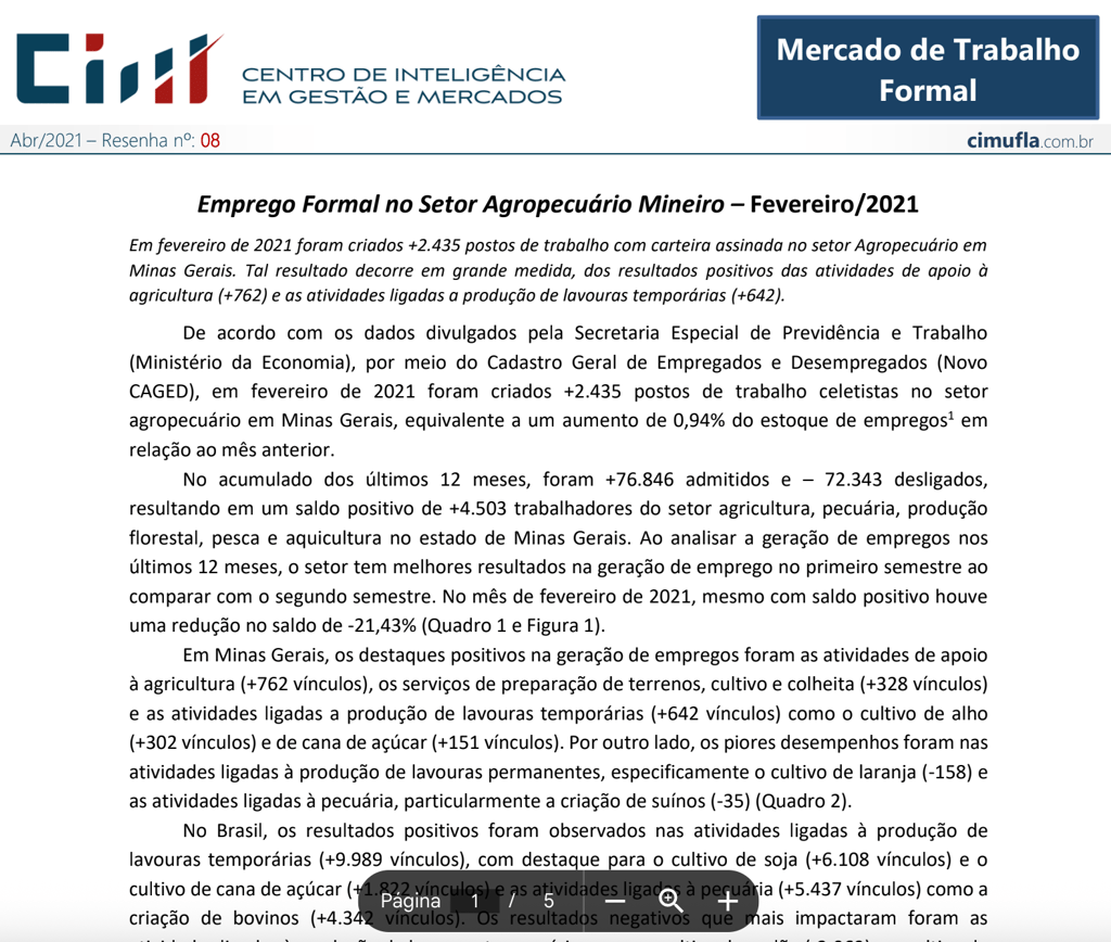 Mercado de trabalho: perfil das ocupações no agronegócio de Minas Gerais no primeiro trimestre de 2021¹