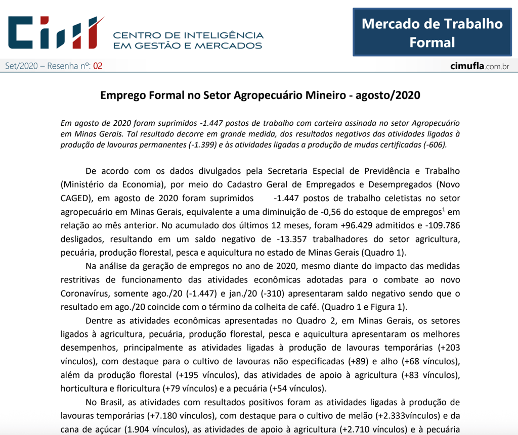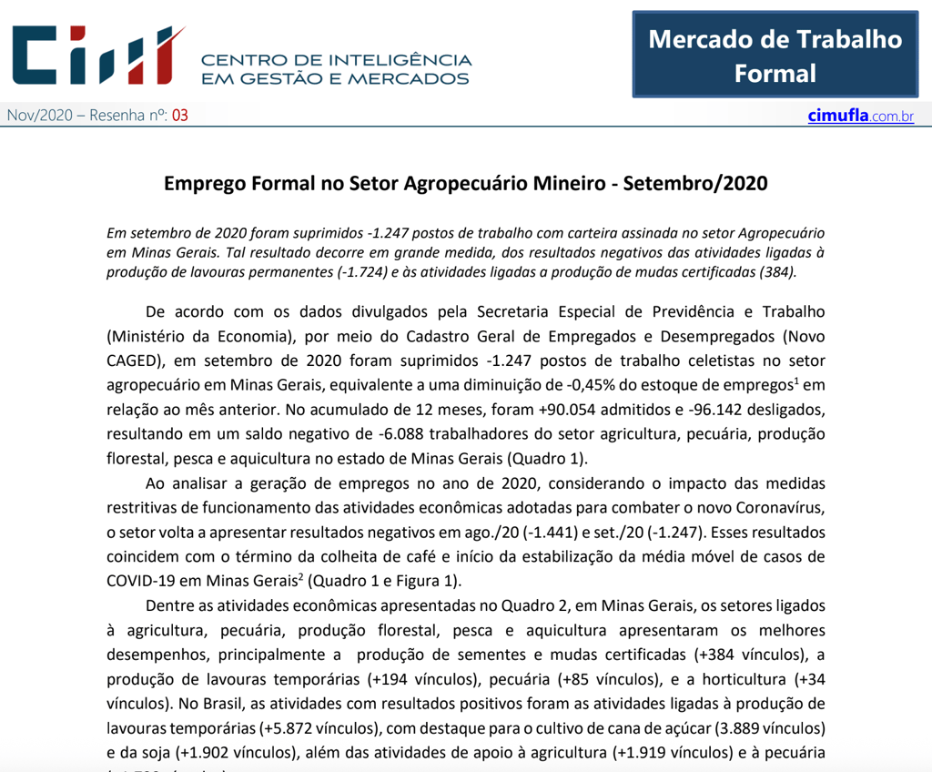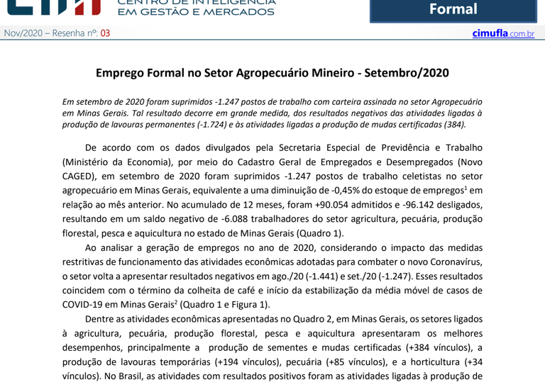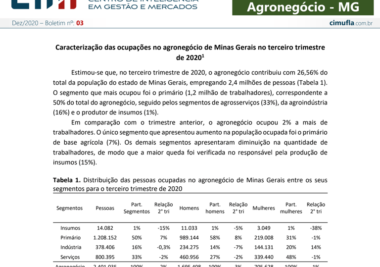 Caracterização das ocupações no agronegócio de Minas Gerais no terceiro trimestre de 2020