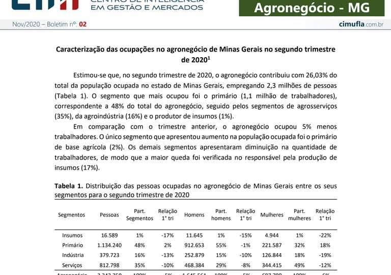 Caracterização das ocupações no agronegócio de Minas Gerais no segundo trimestre de 2020