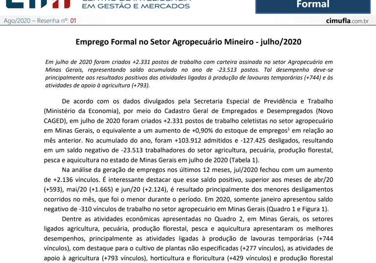 Emprego Formal no Setor Agropecuário Mineiro - julho/2020