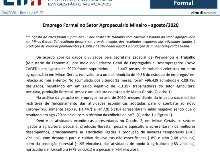 Emprego Formal no Setor Agropecuário Mineiro - setembro/2020