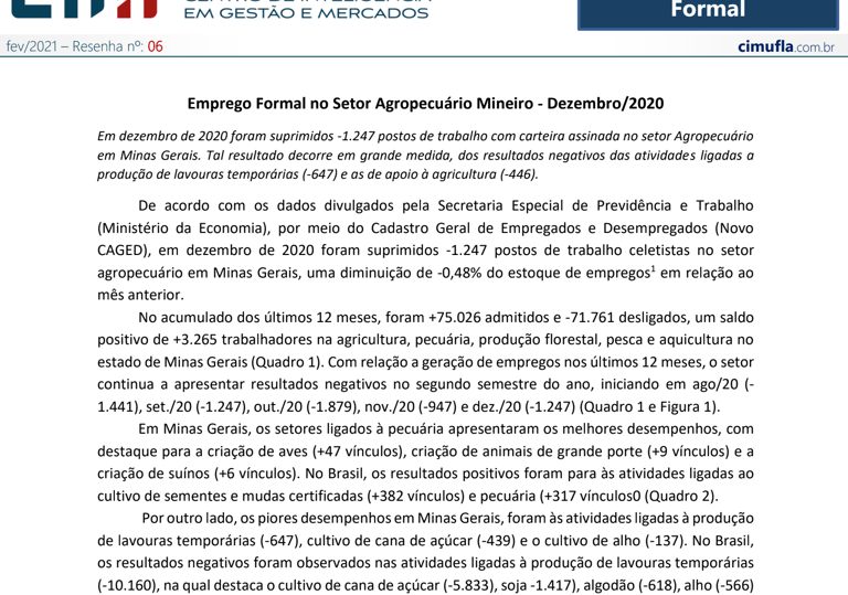 Emprego Formal no Setor Agropecuário Mineiro - dezembro/2020