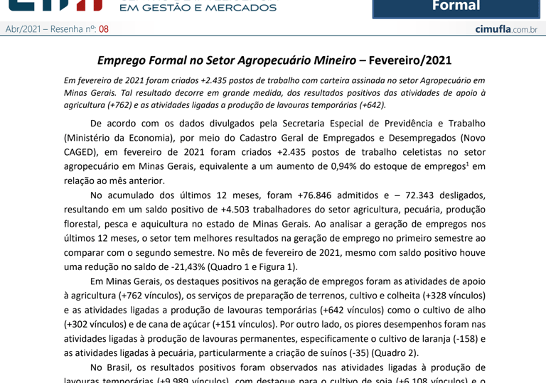 Emprego Formal no Setor Agropecuário Mineiro - fevereiro/2021