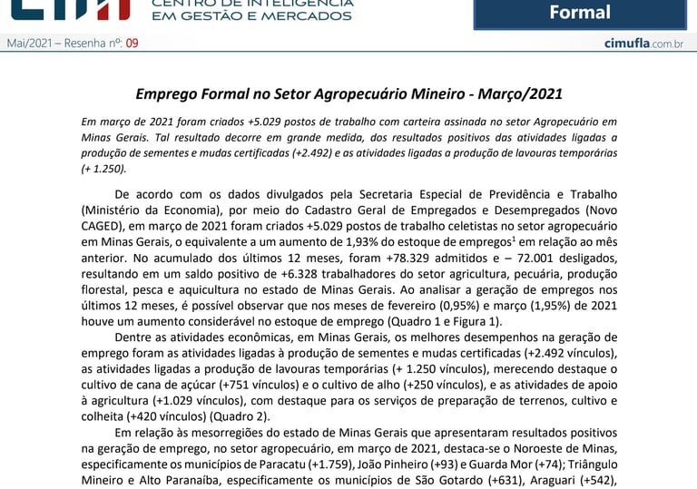 Emprego Formal no Setor Agropecuário Mineiro - março/2021
