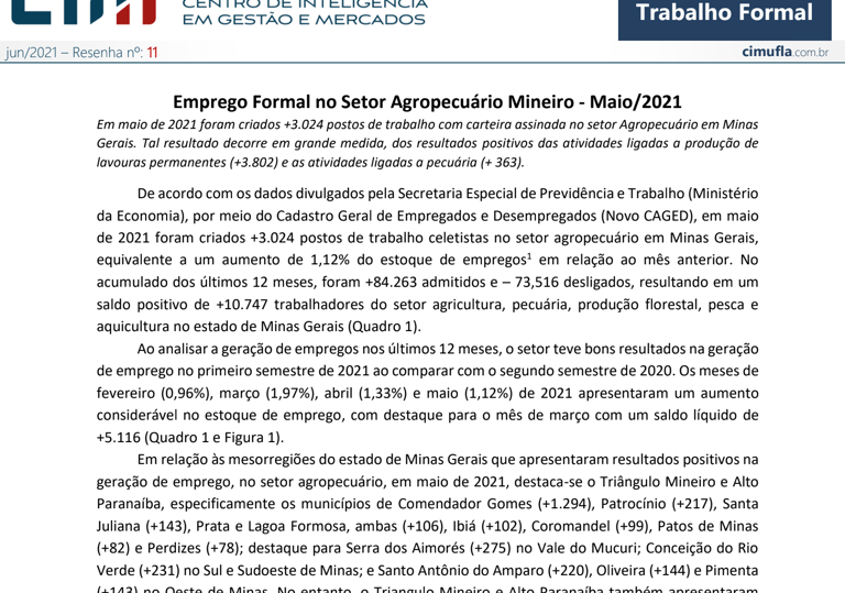 Emprego Formal no Setor Agropecuário Mineiro - maio/2021